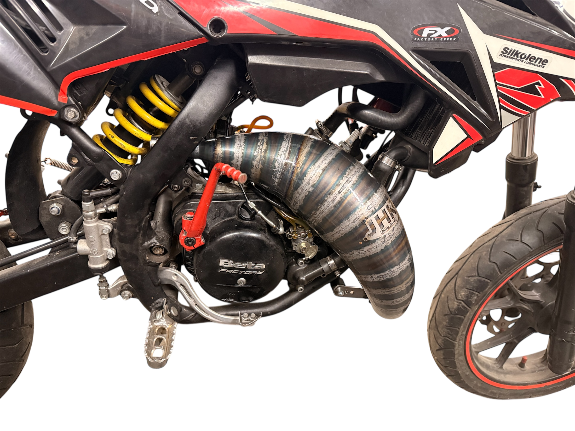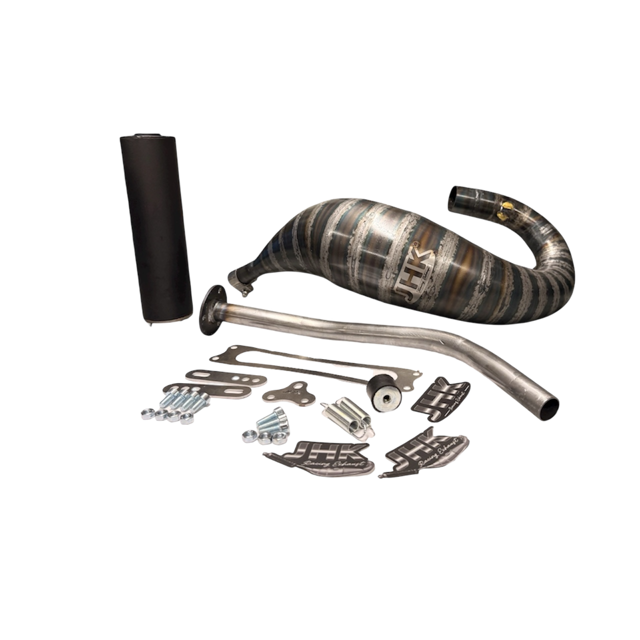 The JHK Racing 80-90 AM6 High Passage exhaust is crafted from 26 cones of steel sheet, each 0.8 mm thick. The exhaust is meticulously handmade using traditional techniques at the JHK workshop, where each piece is individually shaped from sheet metal and then welded together.